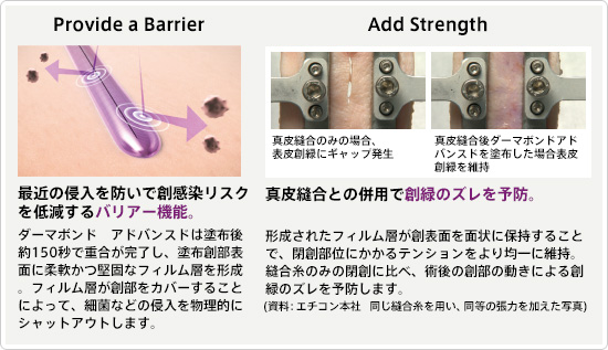 ●塗布後約150秒で重合が完了し、塗布創部表面に柔軟かつ堅固なフィルム層を形成。フィルム層が創部をカバーすることで、細菌などの侵入を物理的にシャットアウトします。