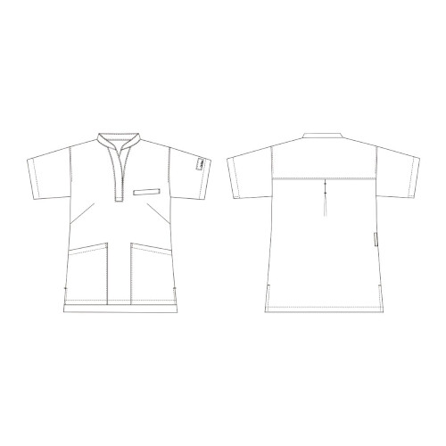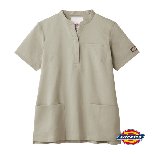 女性らしいシルエットが魅力のスタンドカラー・スキッパータイプのレディーススクラブ。
