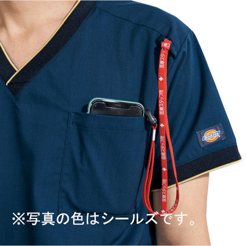 襟元と袖はイエローのアクセントを効かせたオシャレなリブ仕様にすることで、ディッキーズらしいカジュアルなデザインのスクラブにしました。