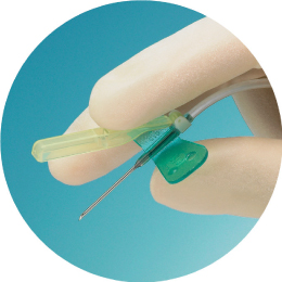 ●従来どおりの方法で使用可能。針刺し防止用のカバーはコンパクトな一体型なので、穿刺時や固定時もスムーズ。