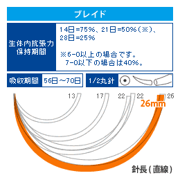 ●生体内抗張力保持期間:14日=75%、21日=50%(6-0以上の場合です。7-0以下の場合は40%)、28日=25%