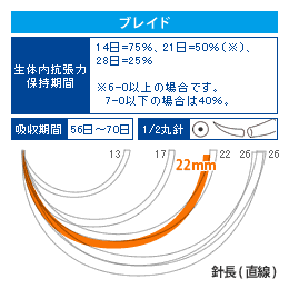 ●生体内抗張力保持期間:14日=75%、21日=50%(6-0以上の場合です。7-0以下の場合は40%)、28日=25%